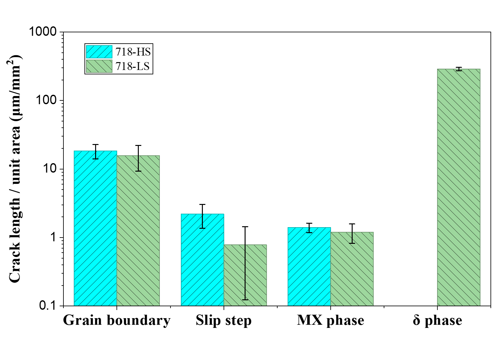 图1. 模拟一回路溶液中SSRT测试后718合金各特征区域单位面积裂纹长度