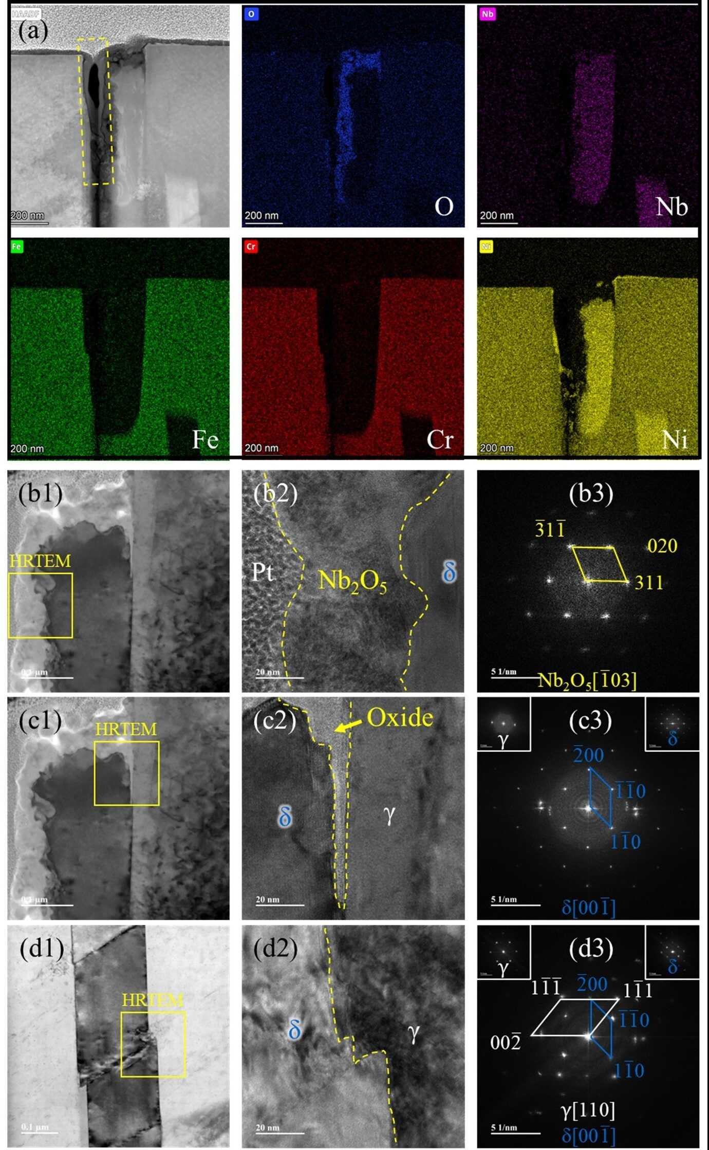 图2. 模拟一回路溶液中SSRT测试后718-LS合金中δ相/基体界面裂纹的TEM表征