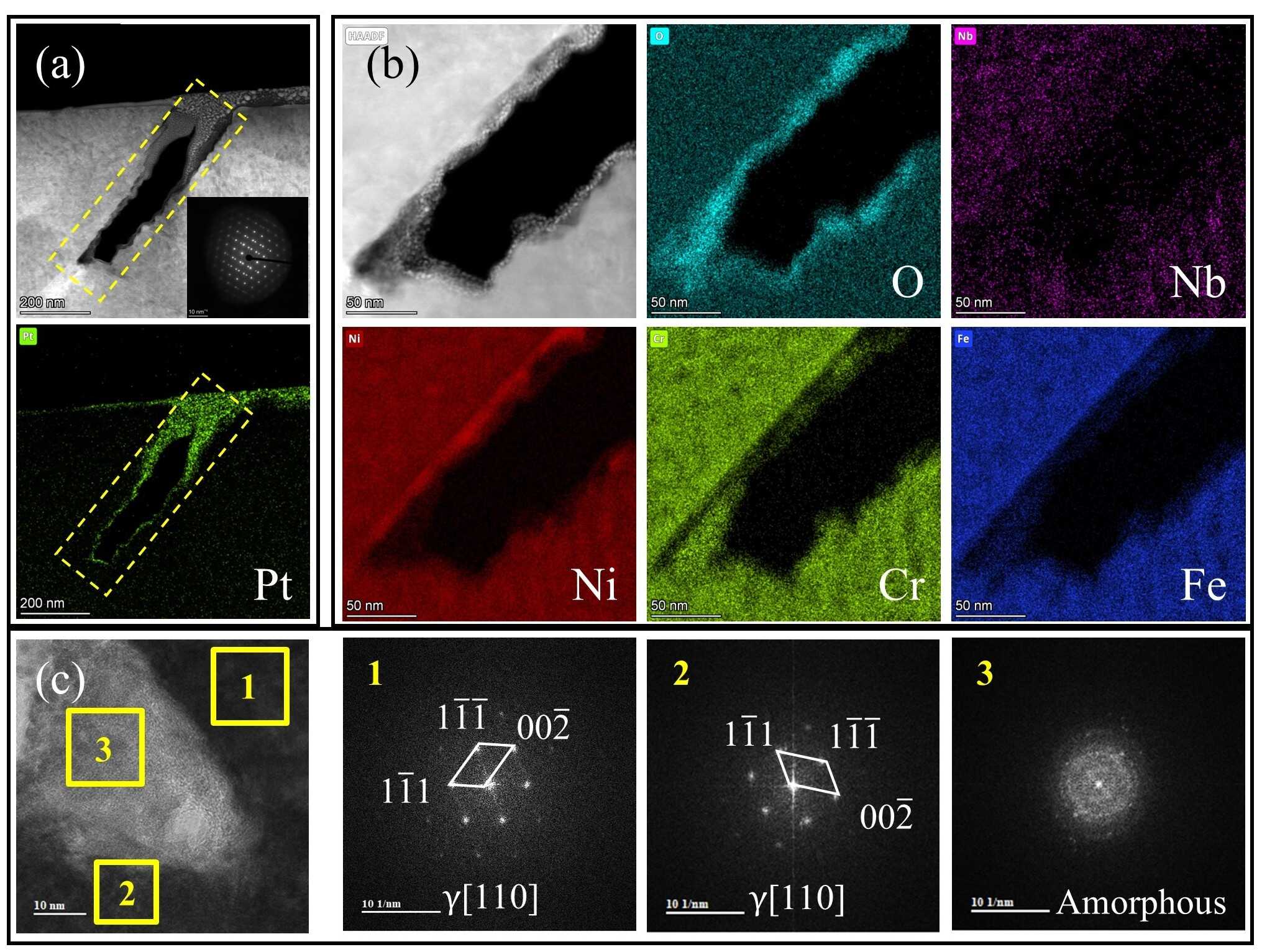 图3. 模拟一回路溶液中SSRT测试后718-HS合金孪晶界处裂纹的TEM表征