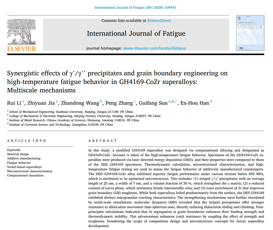 近日,我院韩恩厚院士与孙桂芳教授团队合作,针对航空发动机对高温合金性能要求日益提升的背景需求,通过成分改性设计了一种新型GH4169-CoZr高温合金。该合金基于优化后的成分设计,显著减少了Laves相析出,优化了析出相形态,增加了γ′/γ′′析出相含量,并通过晶界微量Zr元素的强化作用,使合金的高温疲劳寿命得到显著提升。相关研究成果以《Synergistic Effects of γ'/γ'' Precipitates and Grain Boundary Engineering on High-Temperature Fatigue Behavior in GH4169-CoZr Superalloys: Multiscale Mechanisms》为题,发表在疲劳领域国际权威期刊《International Journal of Fatigue》。