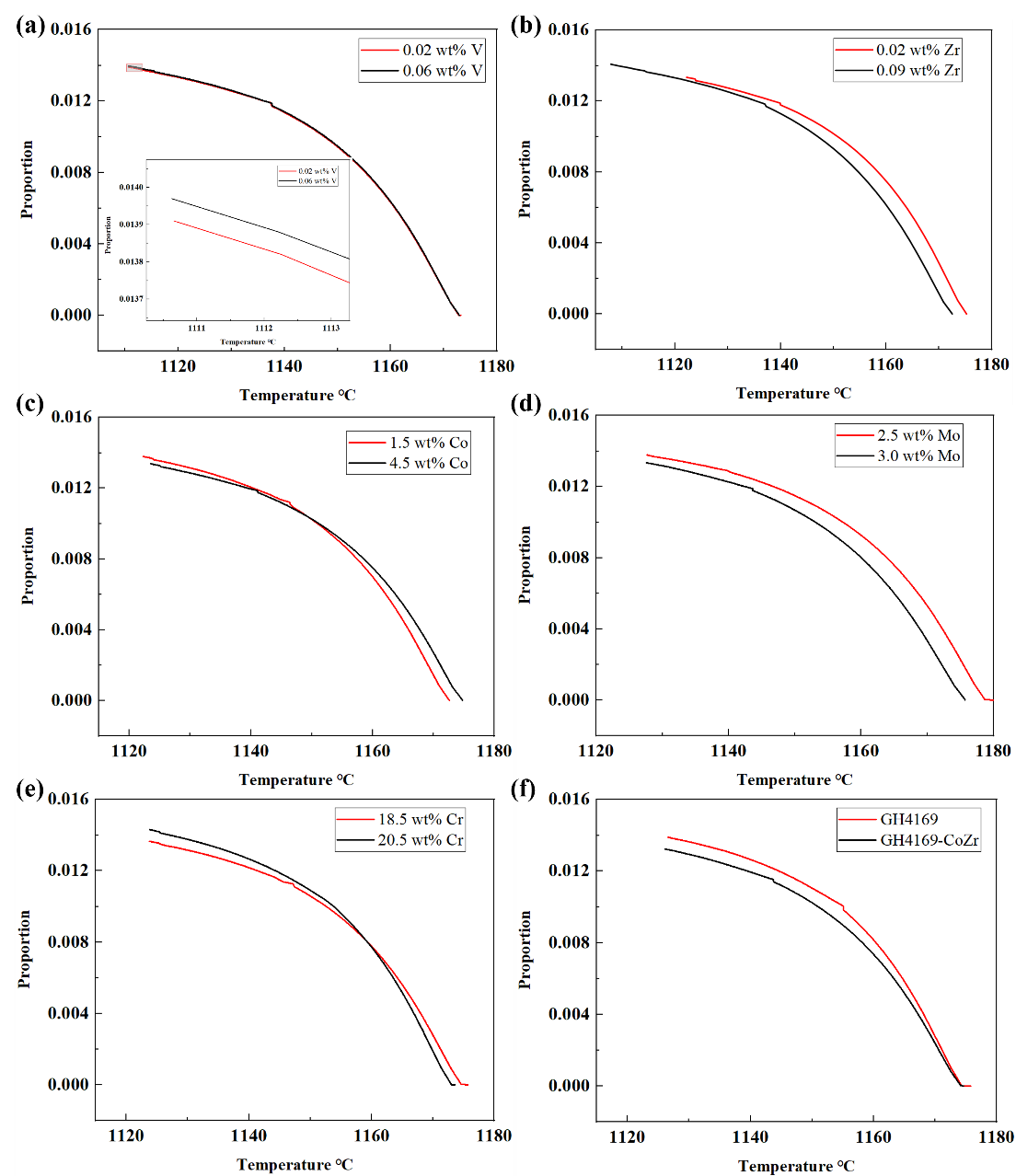 图1 (a-e)添加不同元素时Laves相的非平衡凝固曲线:(a)添加0.02wt % V和0.06wt % V, (b)添加0.02wt % Zr和0.09wt % Zr, (c)添加1.5wt % Co和4.5wt % Co, (d)添加2.5wt % Mo和3.0wt % Mo, (e)添加18.5wt % Cr和20.5wt % Cr;(f) GH4169和GH4169- cozr合金