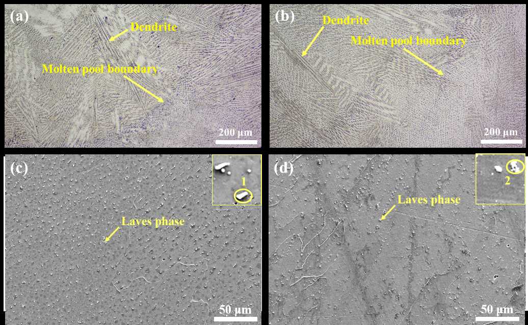 图2 (a, c) DED GH4169和(b, d) DED GH4169- CoZr高温合金的OM图像和SEM图像