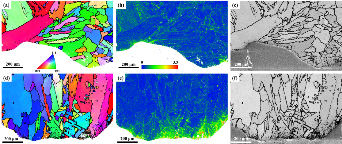 图4 645 MPa/595℃下(a-c) GH4169高温合金试样和(d-f) GH4169-CoZr高温合金试样疲劳断口EBSD图像