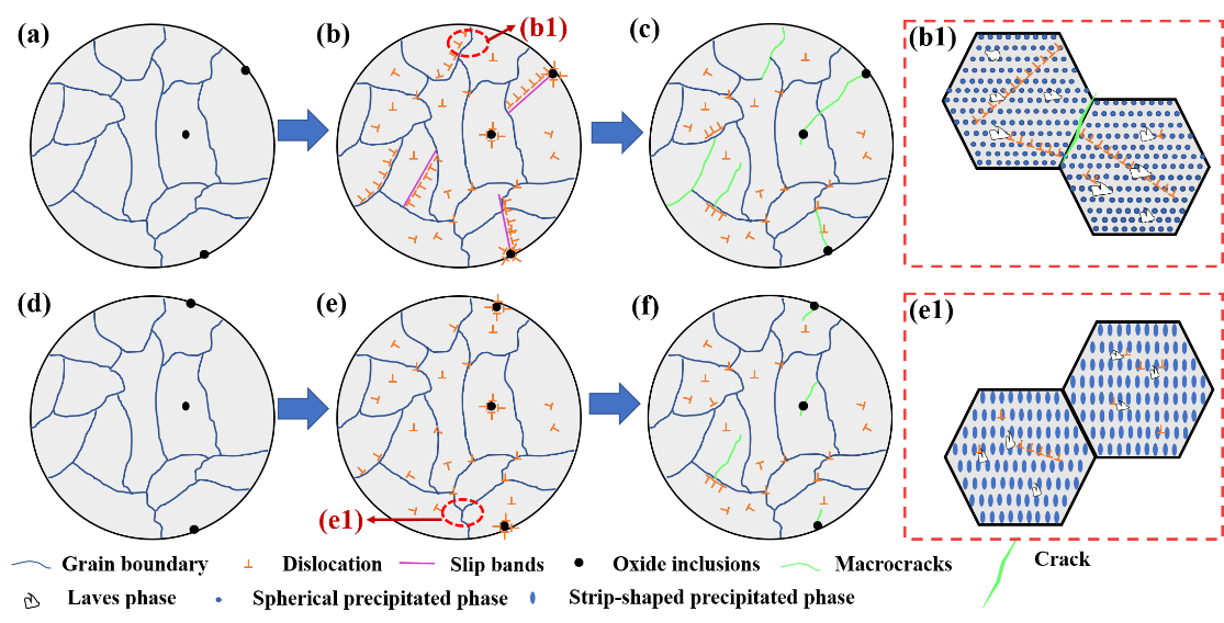 图7 (a-c) GH4169, (d-f) GH4169-CoZr两种高温合金裂纹萌生机理示意图 ((b)和(e)的疲劳次数相等,(e)和(f)的疲劳次数相等)