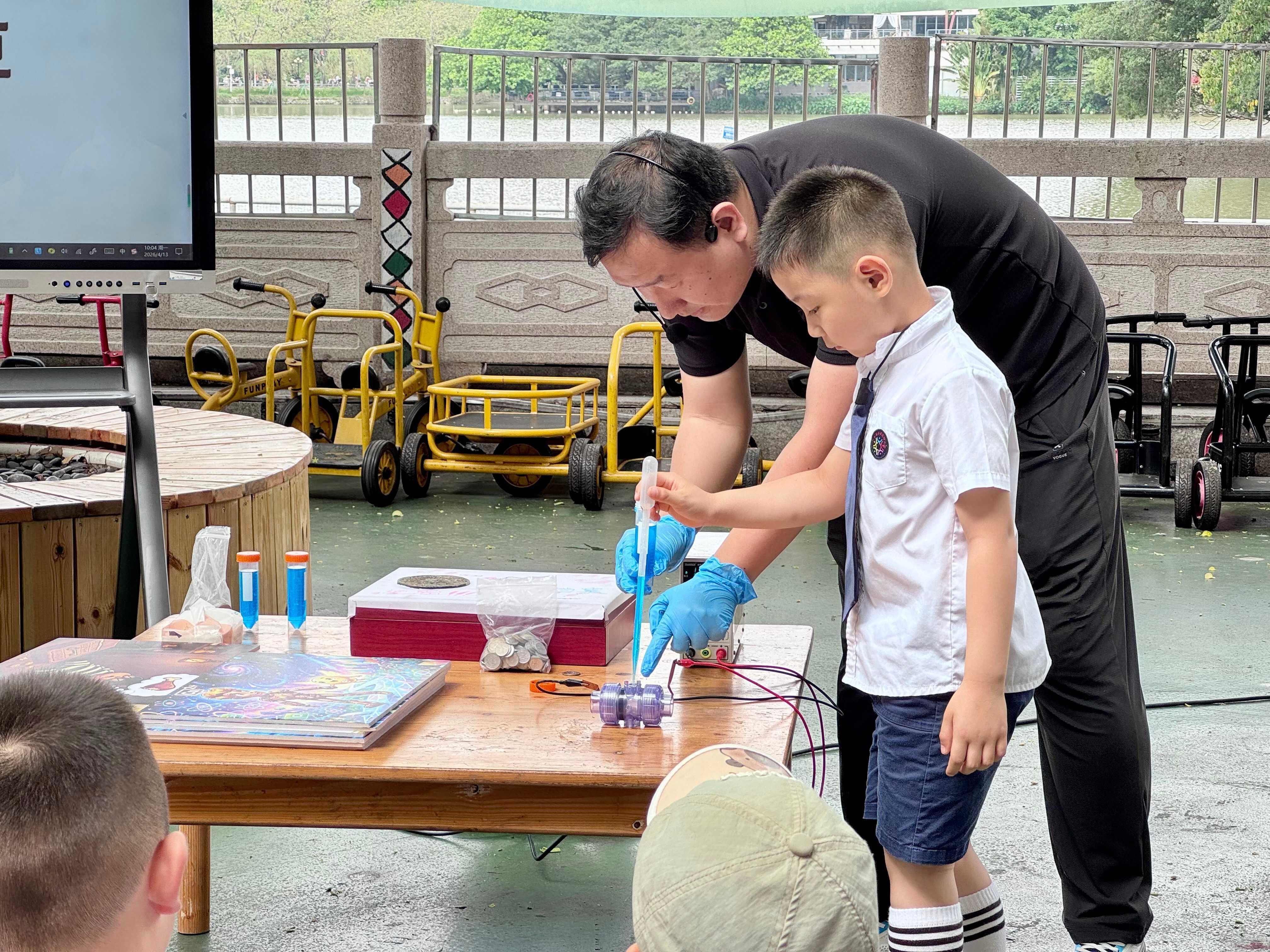 本次活动融合实验课程与原创绘本,面向学龄前儿童开展科学启蒙教育。科普老师盛超不仅带来了防腐院自主研发的科普课程《科学侦探艾克—假币案》,让孩子们化身“小艾克”,在破案过程中亲手操作实验,直观感受科学的魅力;还专门为学龄前阶段孩子量身打造了原创科普绘本——《铜离子找朋友》。